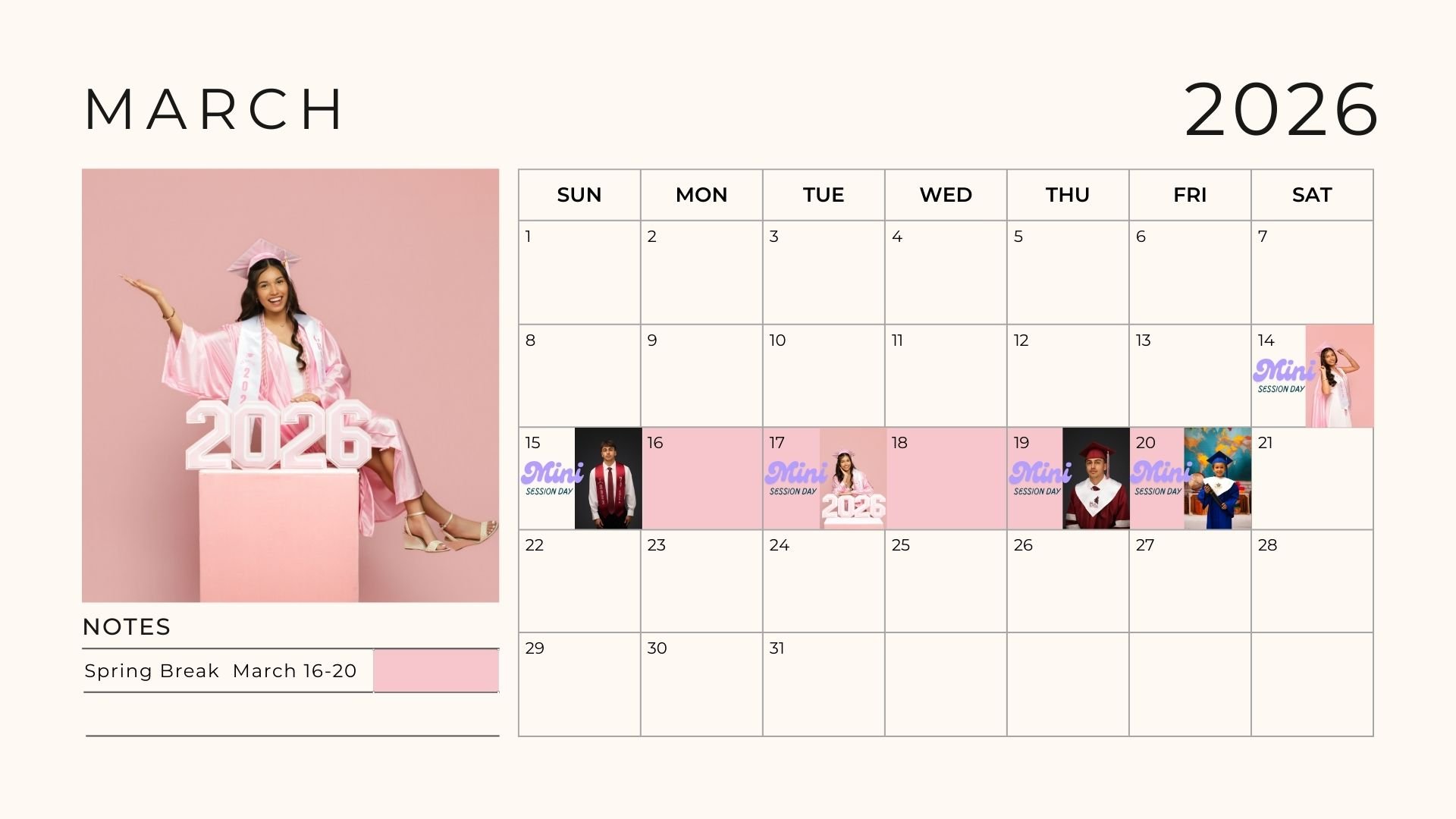 Graduation MinisThese mini dates = lower pricing. Regular studio calendar dates = standard pricing (higher) with more time. Choose what works best for you and book below.